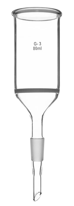 Buchner funnel made of high quality, heavy duty 3.3 borosilicate glass. 80ml capacity. Funnel features a sintered disc with G-3 porosity. Jointed stem, 14/23 cone size. Funnel measures 7.5" in total height. Inner diameter of body measures 43mm and outer diameter measures 46mm. Stem measures 3.3" in length and is 9mm in diameter (at stem end).Eisco Labs Borosilicate glass has the following heat tolerances: Strain Point -515°C | Annealing Point 565°C | Softening Point 820°C.