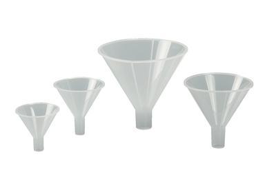 Here is the corrected text: Polypropylene funnels feature a 60° body angle and 58° internal rib angle for rapid filtration. External ribbing prevents air locks. These funnels are resistant to most chemicals, except strong oxidizing agents. • Autoclavable • Resistant to most chemicals • Polypropylene construction Available in four sizes: * Cat. No.: 414004-272, Top I.D.: 147 mm, Stem O.D.: 26.7 mm, Overall height: 136.5 mm, Stem length: 33 mm, Temperature Range: 0 to 135°C (32 to 275°F) * Cat. No.: 414004-271, Top I.D.: 100 mm, Stem O.D.: 20.6 mm, Overall height: 85 mm, Stem length: 29 mm, Temperature Range: 0 to 135°C (32 to 275°F) * Cat. No.: 414004-270, Top I.D.: 80 mm, Stem O.D.: 16 mm, Overall height: 85 mm, Stem length: 29 mm, Temperature Range: 0 to 135°C (32 to 275°F) * Cat. No.: 414004-269, Top I.D.: 65 mm, Stem O.D.: 15.6 mm, Overall height: 67 mm, Stem length: 22 mm, Temperature Range: 0 to 135°C (32 to 275°F)