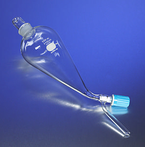 PYREX* brand Separatory Funnel, Squibb, Pear-Shape, Rotaflo* Stopcock^ Capacity: 125ml. Stopcock Plug: 3. Stopper Number: 22. Will not leak or freeze. Needs no lubricants, springs or retainers. Only PTFE and borosilicate glass come in contact with liquid. Includes 1 polyethylene and 1 glass stopper.