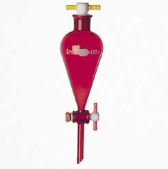 KIMAX* brand Separatory Funnel, RAY-SORB*, Squibb, Pear-Shape, PTFE Stopcock, PTFE Stopper^ Capacity: 500ml. Stopcock Plug Size: 4. Stopper number: 27. Red handle. Large, lower stem I.D. RAY-SORB protects materials sensitive to light of shorter wavelengths. ASTM Specification E1096, Type IV.
