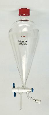 VentSep* Separatory Funnel^ 1000mL. Features a built-in relief valve, a fluoropolymer resin stopcock, and a screw cap with fluoropolymer resin liner. Vents gas pressure over 1psi automatically. Ideal for vigorous hand or machine shaking.