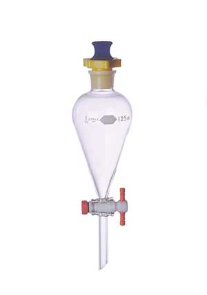 funnel is supplied with a PTFE stopcock plug and with a closed-bottom, linear high-density polyethylene stopper to fit in the Standard Taper ground neck, Lower stems have an ID large enough that a column of liquid will “break” with the stopcock closed, thereby giving a more complete separation and eliminating the necessity of emptying the funnel