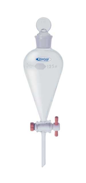 Kimble KIMAX® KimCote® plastic-coated pear-shaped funnel. Supplied with a Standard Taper ground glass stopper and a totally autoclavable PTFE stopcock plug, Lower stems have an ID large enough so that a column of liquid will "break" with the stopcock closed, thereby giving a more complete separation and eliminating the necessity of emptying the funnel