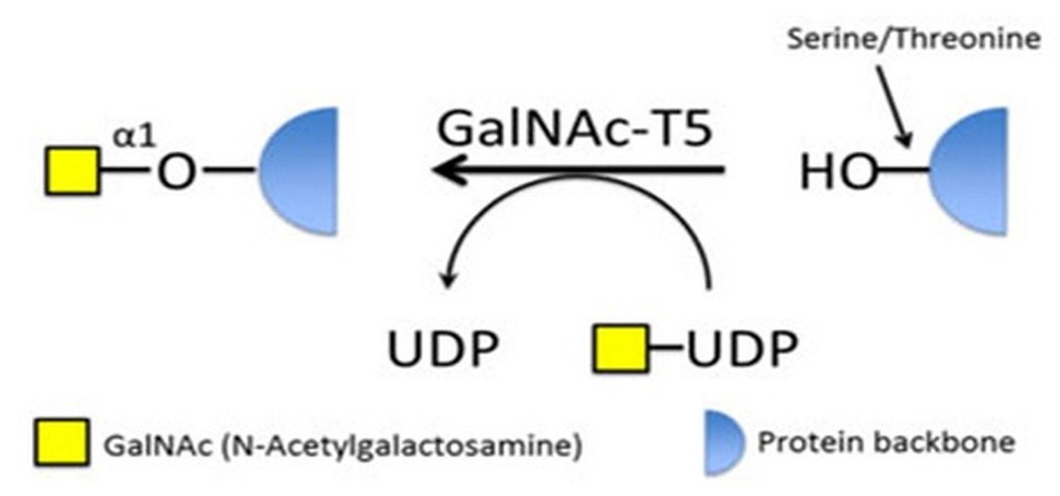 GalNAc-T5, soluble fragment 5ug^ GalNAc-T5, soluble fragment, Source Insect cells, Species: Human, Purity by SDS-PAGE > 90%, Biological Activity Specific activity >300 pmol/min/ug, Synonyms: Polypeptide N-acetylgalactosaminyltransferase 5, Polypeptide GalNAc transferase 5, GaNTase 5, SIze: 5ug