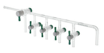 GAS MANIFOLD, 4-PLACE, FLUOROPOLYMER RESIN STOPCOCKS^ Overall Length: 365mm. Similar to CG-1816 but supplied with all fluoropolymer resin stopcocks.