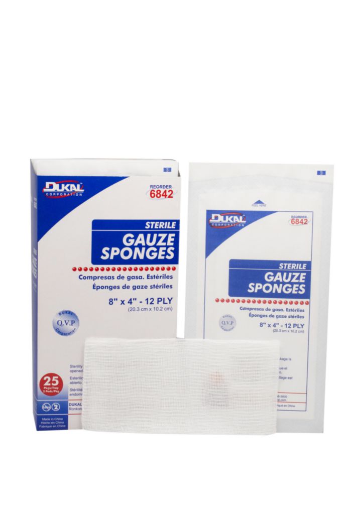 Dukal Gauze Sponges are 100% cotton^ A highly absorbent sponge ideal for a numerous applications. Can be used for general cleaning, dressings, prepping, packign and debriding wounds.