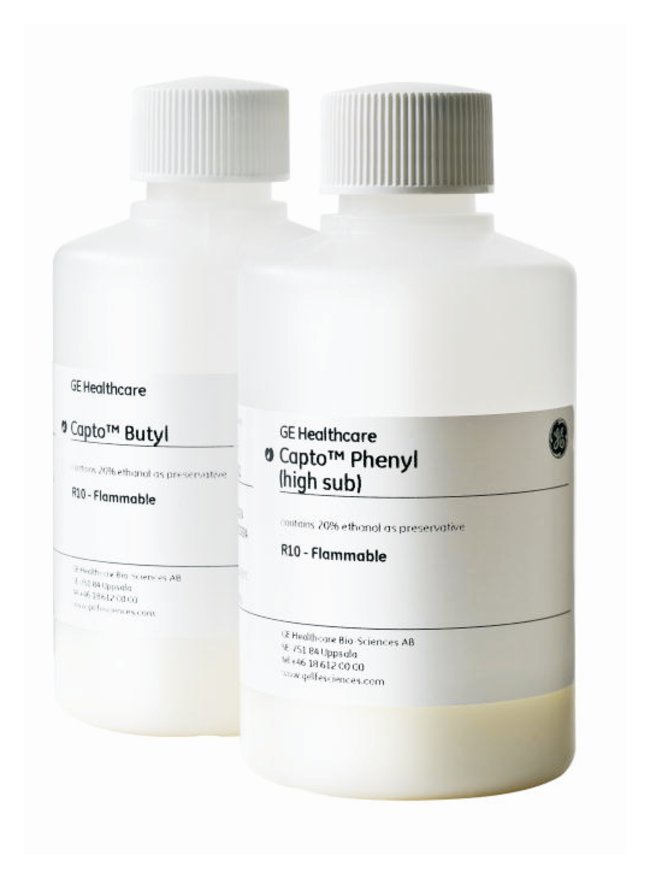 High flow rate, high capacity and low backpressure reduce cycle timesChemically stable to commonly used aqueous buffersEpoxy chemical couplingCapto Phenyl (high sub) has a hydrophobic ligand of phenyl and is a hydrophobic interaction chromatography medium used for protein purificationCapto Butyl has a hydrophobic ligand of butly and a highly cross-linked agarose matrixUsed in capture and intermediate stages of protein purificatio