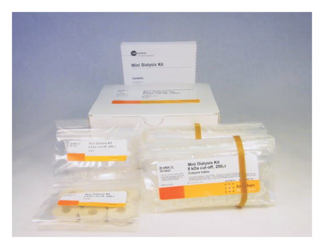 Offer a simple solution to the handling problems of small volume dialysis. The dialysis tubes in the kit each have a cap that incorporates a small disk of dialysis membrane.