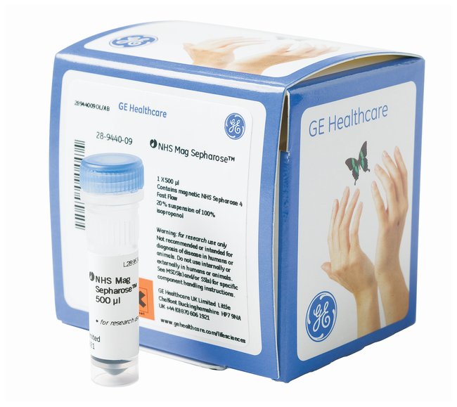 NHS Mag Sepharose are magnetic beads designed for pull-down techniques enabling rapid capture and enrichment of selected proteins based on affinity. An antibody or other protein with desired affinity is covalently coupled to the medium via primary amines for the purpose of capture of target proteins of interest.Visible and dense Sepharose based magnetic beads with N-hydroxysuccinimide (NHS) ligand, easy to spot and collect bound target proteinNon-adherent beads eliminate smearing effects and aggregate formation. Can be used without detergentsSimple capture of target protein in small or large sample volumes (low microliter to high milliliter scale)Optimized capacity for enrichment/pull-down of target proteins - only low amounts of bound capture moleculeFlexible protocols with elution conditions optimized for downstream applications such as electrophoresis and MSMatrix: Paramagnetic, spherical, highly cross-linked agarose particles Ligand: N-hydroxysuccinimide Ligand density: 8-14μmol/mL gel Particle size: 37-100μm Working temperature: Room temperature Storage solution: 20% 2-propanol Storage temperature: 4°C to 8°C