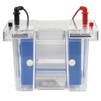 Labnet's ENDURO™ Vertical PAGE System is modular - allowing PAGE, electroblotting and 2D gel electrophoresis to be carried out in the same tank, simply by changing the inserts. Users can purchase only the parts they need, or a complete combined system for a cost savings over buying all three systems separately.Modular designPAGE, Electroblotting and 2D ElectrophoresisQuick and easy set upWide range of accessoriesMODULAR SYSTEMThe modularity of the ENDURO™ System is based on three operational inserts and a common buffer tank. All three inserts, PAGE, electroblotting and 2D electrophoresis, have their own electrode assembly that connects into the lid of the buffer tank.PAGE INSERTSet up of gels is quick and easy with the PAGE insert. A set of plates are placed on either side of the insert and held into place by the pressure bar. An additional gel may be run on each side by stacking the plates. The assembly is then placed into the casting stand for pouring the gel. After the gel is polymerized, the insert is removed from the casting stand and placed in the buffer tank.ELECTROBLOTTING INSERTThe electroblotting insert has a capacity for 3 gels. Setting up blots is easy - gels are sandwiched in the blotting cassettes with the transfer membranes. The cassettes are then placed in the insert, which is in turn placed in the buffer tank. Coiled electrodes in the insert generate a high intensity current, allowing transfer to take place in about an hour.2D ELECTROPHORESIS INSERTThis insert is used for running the first dimension of IEF gels. Up to ten 8 cm gels are poured in disposable capillary tubes and placed in this insert. Gasketed ports allow for easy insertion and removal of tubes. Blocking plugs are included for closing off ports that are not in use.BUILT FOR SAFETY AND ENDURANCEFor leak-proof performance and a long service life, the buffer tank is molded from high quality acrylic. Pins on the top of the inserts ensure that the lid is placed onto the insert in the proper orientation. These pins also aid in removal of the lid. Removing the lid disconnects power to the electrodes.ACCEPTS MOST PRE-CAST GELSMost precast gels, including NuSep™, Bio-Rad™, Invitrogen™, and Cambrex™, can be used with the ENDURO™ PAGE System. The use of precast gels saves time by eliminating the need to pour gels and wait while they polymerize.WIDE RANGE OF ACCESSORIESA variety of combs and spacers of varying widths are available to customize your ENDURO™ system. All are color coded and clearly marked for easy identification. Both notched and plain plates can be purchased with spacers permanently bound for easy set up. Additional fiber pads and replacement cassettes are also available as well as capillary tubes, blanking ports and tube supports. Cooling packs are also available to help reduce buffer temperature during higher voltage or longer runs.