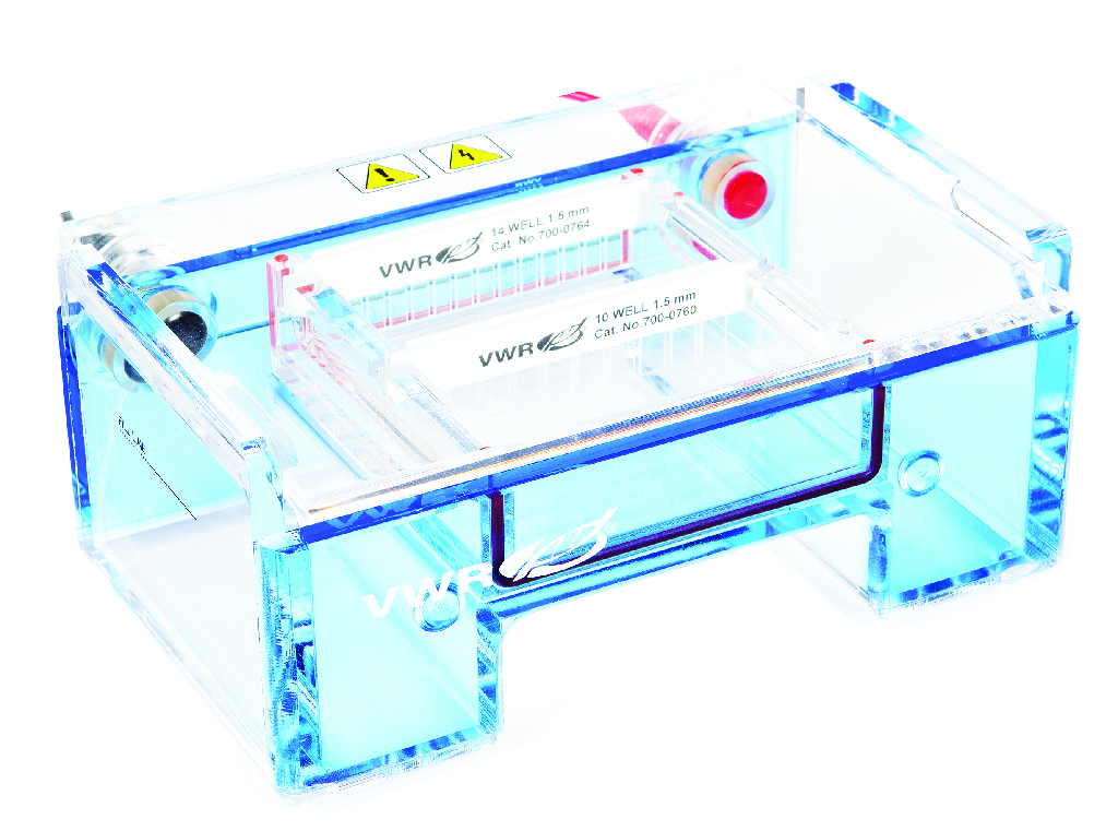 The MINI M electrophoresis system is a very convenient size for a wide range of routine uses. A wide range of standard and MC-compatible loading combs are available, separation of up to 36 samples., 11_Delivery: Includes a safety lid with retractable sheathed leads, UVT gel tray and two combs, one each 10 well and 14 well (1.5 mm thick)., VWR® MINI M Horizontal Gel System, No. of samples: 5 - 36, Cat. No.: 76314-748, L×W×H: 150×220×95 mm, Buffer volume: 600 ml, Gel size: 9×11 cm, Final SAP Desc Link: 6062079, SAP Description Status: Ready, The MINI M electrophoresis system is a very convenient size for a wide range of routine uses. A wide range of standard and MC-compatible loading combs are available, separation of up to 36 samples., 11_Delivery: Includes a safety lid with retractable sheathed leads, UVT gel tray and two combs, one each 10 well and 14 well (1.5 mm thick)., Final SAP Desc Link: 6062079, SAP Description Status: Ready
