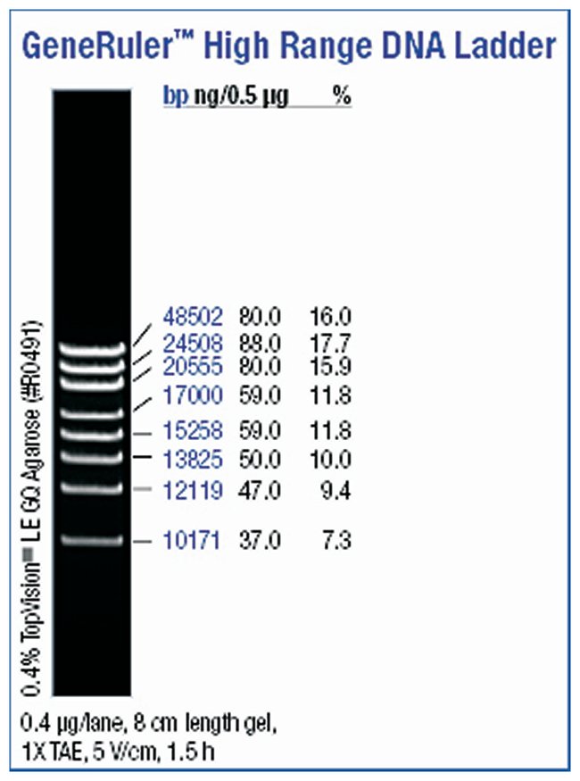 GeneRuler High Range DNA Ladder is recommended for fast sizing and approximate quantification of high molecular weight double-stranded DNA on agarose gels (in 1.5hour, 0.4%agarose gel). The ladder is a mixture of chromatography-purified individual DNA fragments.GeneRuler High Range DNA Ladder can be labeled radioactively with T4 Polynucleotide Kinase (seeProtocol in the Resources.)The ladder is supplied with 6X DNA Loading Dye for sample DNA.GeneRuler High Range DNA Ladder is recommended for fast sizing and approximate quantification of high molecular weight double-stranded DNA on agarose gels (in 1.5 hours, 0.4% agarose gel). The ladder is a mixture of chromatography-purified individual DNA fragments. GeneRuler High Range DNA Ladder can be labeled radioactively with T4 Polynucleotide Kinase.The ladder is supplied with 6X DNA Loading Dye for sample DNA. Ideal for both DNA sizing and approximate quantificationSharp bandsSupplied with loading dye for sample DNAIdeal for fast sizing of high molecular weight DNA fragmentsThis product(s) resides on a Fisher Scientific GSA or VA contract. If you are viewing this page as a nonregistered user, the price(s) displayed is List Price. To view your GSA or VA contract pricing, log in using your account number, or become a registered user by contacting one of our Customer Service teams. You can also view your contract price by searching for this item(s) on GSA Advantage. To place an order, contact Fisher Scientific Customer Service.