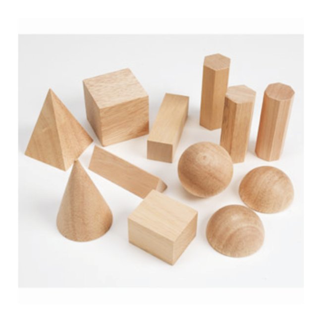 Basic Geometry Solids — Set of 6Wooden shapes includes cube, cylinder, sphere, cone, triangular prism and pyramidGrades 1 to 4Geometric Solids — Set of 12Wooden shapes include cones, sphere, cube, cylinders, pyramid, prism, hemisphere and rectangular solidsTeacher notes and shape chartGrades 1 to 8