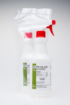 DECON-GLASS* Glass Cleaner^ One-step, ready-to-use, residue remover and glass and Plexiglas* cleaner formulated with USP purified water. Prefiltered to 0.2u, gamma irradiated, double-bagged. Lot-specific Certificates of Irradiation and Analysis, Sterility Report. 473mL trigger bottle.