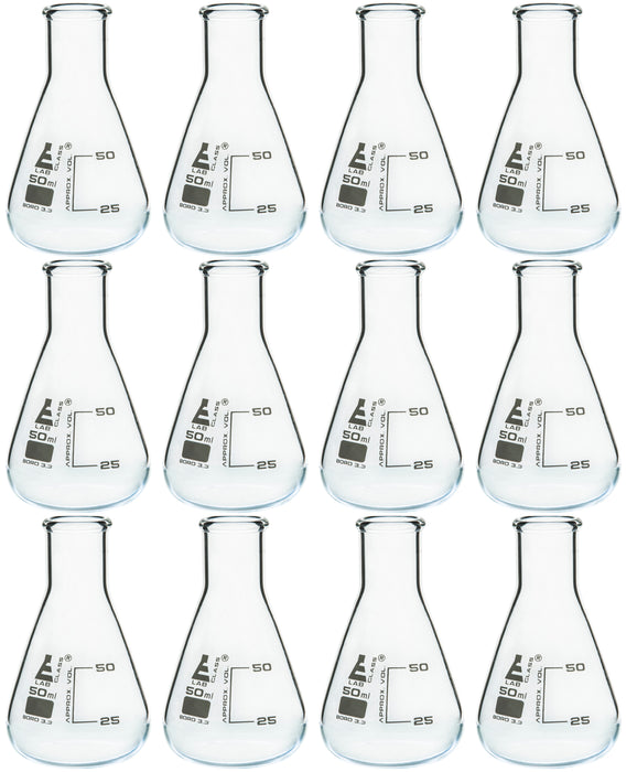 This pack of 12 Erlenmeyer flasks, each with a 50mL capacity, features easy-to-read white enamel graduations every 25mL. Made from high-quality, heavy-duty borosilicate 3.3 glass, these flasks offer excellent strength against breakage and can withstand high temperatures and thermal shocks. They are microwavable and autoclavable, with superior chemical durability. The uniform wall thickness is ideal for heating, and the reinforced rim provides protection against high impacts. Conforming to DIN ISO 1773 standards for narrow neck conical flasks, these Erlenmeyer flasks offer superior chemical durability and heat tolerance. Designed for professional laboratories, they are also an ideal choice for science classrooms and household use. Each flask features white enamel graduations every 25mL, a uniform wall thickness ideal for heating, and a reinforced rim to protect against accidental impacts. They meet DIN ISO 1773 standards for conical flasks and are autoclavable, with superior chemical durability. The borosilicate glass has a low temperature gradient and can withstand high temperatures and thermal shocks, with heat tolerances of strain point 515°C, annealing point 565°C, and softening point 820°C.