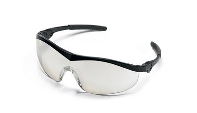 Safety Glasses^ Storm* safety glasses with black frames, indoor/outdoor clear mirror lenses and ratchet temples.