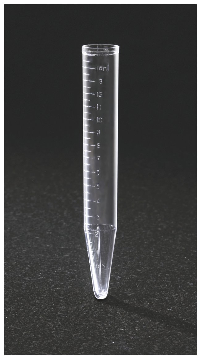 Polystyrene (PS)16.6 × 120mmMax. speed: 1500rpmGraduated from 0.5 to 15mL in 0.5mL incrementsOrder InfoPackaged 250/pack, 2 packs/case (500 tubes)