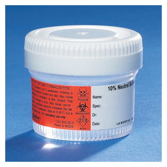 Translucent, polypropylene containersPrefilled with 10% neutral buffered formalinRibbed edges on cap and bottom for easy grippingComes with warning label, expiration date, lot number and white area for patient informationCompliance95kPa compliant