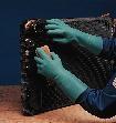 STANSOLV* Nitrile Gloves^ A-14. Green. Hand-specific. Case-hardened finish. Resist most solvents, oil, grease, fats, acids, alkalis, alcohols. Resist punctures, abrasion. Curved finger. Tapered wrist. Flat cuff. Comply with 21 CFR 170-199. Embossed Z-pattern grip. 22mil thick. 35.6cm long. Size: 7.