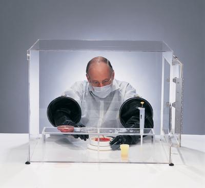 SIDENTRY* Glove Box^ Constructed from 0.6cm clear acrylic. Features 44.5Wx44.5Hcm side entry with gasketed door. Front ports accept standard glove box gloves. Four adjustable levers ensure stability. Supplied with a stopcock to mount. Overall dimensions: 76.2Wx61Dx61Hcm. Front ports: 20.3dia.cm.