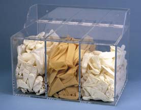 Multi-Compartment Glove Dispenser^ Three compartments. Made from clear, clean, 6mm acrylic with separate lid for each compartment. Edges are flame treated for smoothness. Supplied with heavy-duty wall bracket and support bar for mounting the dispenser to wall. Dimensions: 40.6Wx30.5Hx29.2Dcm.