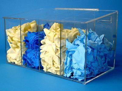 Glove Dispenser^ 4 compartment Includes a sloping lid. Clear 1/4in acrylic with full length hinge for durability. Mounts to wall of free-standing. Mounting bracket and support bar included. Dimensions: 21.25in w x 12in h x 12in d.