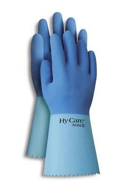 Hy-Care* Cotton Lined High Quality Latex Gloves^ Features A Soft Knit Cotton Liner That Helps Keep Hands And Fingers Comfortable In Hot/Cold Environments. Style 62-400, Blue, Pinked Cuff, 12" Size 9