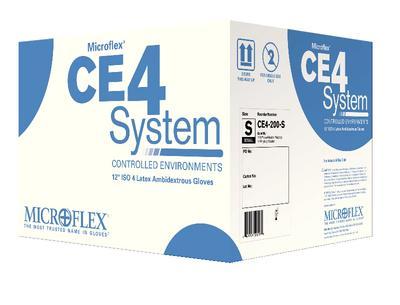 CE4 System Washed Latex Ambidextrous Gloves^ Powder-free. ISO Class 4. Low surface particulates, ionic extractables. Free of silicon, DOP, amides. Textured fingertips. Beaded cuff. Length: 30.5cm. Thickness: 7.1mil (finger), 6.3mil (palm). Color: natural. Size: medium.