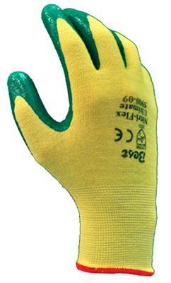 Nitri-Flex* Ultimate Gloves^ Seamless shell knit from aramid fibers wrapped with Lycra*. Palm-dipped in nitrile. Abrasion- and cut-resistant. Textured nitrile coating for superior handling, tactile dexterity. Color: yellow with green palm dip. Length: 22.2cm. Size: 8 (medium).