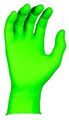100% Nitrile Gloves^ Long cuff, powder-free. 100% accelerator-free nitirle gloves. 5-mil thickness. 11 inches long, low-modulus formulation. Rolled cuff. Hi-vis green color. Smooth grip. Qualifies as a Class 1 Medical Device. Extra small.