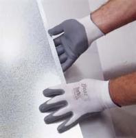 Sponge-Nitrile Gloves^ Flat-dipped, seamless nylon liner, patented sponge nitrile coating. Ergonomic design, breathable liner. White color with steel blue dip. Smooth grip. Large.