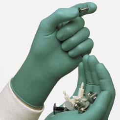 Touch N Tuff* Premium Quality 100% Nitrile Gloves^ Disposable gloves made with 100% nitrile, contains no fillers, silicones, or plasticizers. 4 mils thick, 9.5 inches length. Style 92-500, teal, lightly powdered. Size 6.5-7