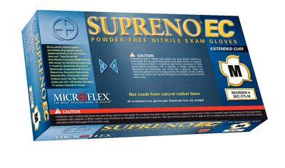 Supreno* EC Powder-Free Nitrile Exam Gloves^ Large. Soft, durable nitrile formulation for elasticity and comfort. Textured fingers allow for reliable grip in wet and dry conditions. Extended cuff and gradient dipping for added protection. Nonsterile. Color: blue. Length: 295mm. Ambidextrous.