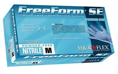 Free Form* SE Nitrile Powder-Free Gloves^ Small. 100% latex free. Micro-textured fingertips for a secure grip in wet and dry conditions. Modulated elasticity minimizes hand stress. Polymer-coated for easy donning, even in wet conditions. Color: blue. Ambidextrous. Beaded cuff.