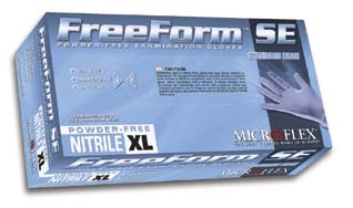 Free Form* SE Nitrile Powder-Free Gloves^ X-Small. 100% latex free. Micro-textured fingertips for a secure grip in wet and dry conditions. Modulated elasticity minimizes hand stress. Polymer-coated for easy donning, even in wet conditions. Color: blue. Ambidextrous. Beaded cuff.