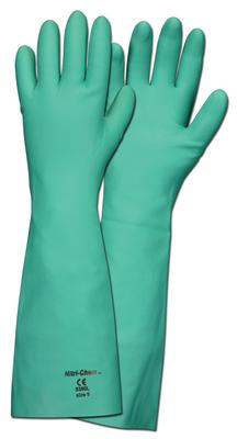 Nitrile Gloves^ Unlined, 22-mil nitrile gloves. Green, 18 inch length, textured grip. Size: Large.