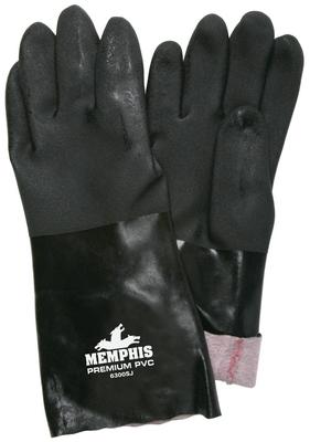 PVC Gloves^ Premium, double-dipped, sandy finish PVC gloves with interlock lining. 14 inch length. Size: Large.