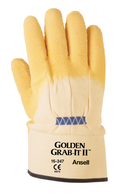 Golden Grab-it* II Premium Rubber Coated, Crinkle Finish Gloves^ Golden Grab-it* II are the most cut resistant, and comfortable gloves of their kind on the market. Sharp edges roll over the surface texture instead of cutting into the glove. Style 16-347, palm coated, safety cuff. Size 10