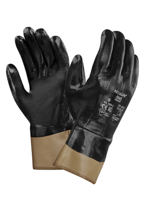 NitraSafe* Premium Gloves^ In sharp, oily, puncturing, and abrasive environments, NitraSafe* outperforms leather and cut resistant automatic knit liners. A combination of nitrile and kevlar* fibers enables the gloves to resist cuts better than leather. Style 28-359, fully coated, safety cuff. Sz8