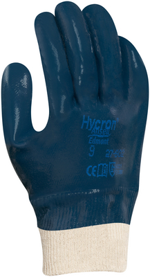 Hycron* Nitrile Coated, Abrasion Resistant Gloves^ Hycron* are perfect replacements for cotton and leather gloves. Heavy duty nitrile coating gives good dry grip and good services for handling abrasive materials. Style 27-602, fully coated, knitwrist. Size 8