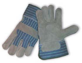 Silver Series "A/B" Grade Select Shoulder Split Cowhide Leather Palm Gloves^ Blue And Green Striped Fabric Back And Cuff, Double Leather Palm, Rubberized Safety Cuff. Medium