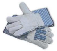 Silver Series "A/B" Grade Select Shoulder Split Cowhide Leather Palm Gloves^ Blue And Green Striped Fabric Back And Cuff, Knucklestrap, Rubberized Gauntlet Cuff. Medium.