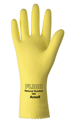 Fl100 Natural Latex, Cotton Flock-Lined Light Duty Gloves^ These Natural Latex, Cotton Flock-Lined Gloves Provide A High Degree Of Tensile Strength While Maintaining Excellent Sensitivity. Style 198-Yellow, Pattern Grip, 17 Mil Thick, 12" Size 10