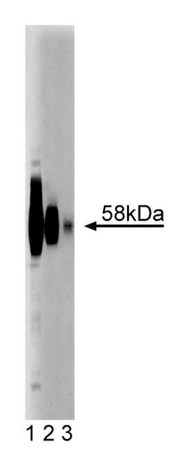 Although dormant in resting granulocytes, macrophages, and B lymphocytes, the neutrophil respiratory burst oxidase (NADPH-oxidase) generates superoxide and secondary oxygen-derived toxic products in response to bacteria or a variety of soluble stimuli. It is an integral membrane cytochrome, b558, which consists of two subunits, gp91[phox] and p21[phox]. Upon stimulation, cytochrome b558 forms a complex with cytosolic proteins, p67[phox], p47[phox], p40[phox], and rac2 and produces superoxide anions in a NADPH-dependent manner. In chronic granulomatous disease (CGD), severe recurrent bacterial and fungal infections result from defective NADPH-oxidase activity. The majority of CGD cases are caused by a defective gp91[phox] gene. gp91[phox], implicated as a docking site for p47[phox], is membrane glycoprotein with multiple N-terminal hydrophobic domains and a hydrophilic C-terminus. The expression of gp91[phox] is restricted to terminally differentiated phagocytes and B lymphocytes. This cell type- and developmental stage-specific expression may be controlled by transcriptional activators, such as PU.1 and YY1, and transcriptional repressors, such as CCAAT displacement protein (CDP). Endogenous mouse gp91phox shows 58kDa band, instead of 91kDa observed in human. Both mouse and human deglycosylated gp91 are 54kDa. This difference may be due to less glycosylation sites in the mouse sequence.Host Species: MouseClone: 53Isotype: IgG1Species Reactivity: MouseImmunogen: Mouse gp91[phox] aa. 450-556Formula Weight [Chemical]: 58kDaImmunofluorescence, Western Blotting