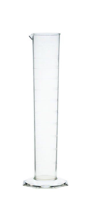 1000ml Graduated Cylinder, made of TPX plastic, with raised graduation lines. Class B Tolerance. This cylinder has an octagonal base for extra stability and spout for easy pouring. Graduation lines every 0.5ml. Stands approximately 16.5" tall, with a tube diameter of 3". Autoclavable, with a temperature range from -180 to 145°C, and provides excellent contact clarity.