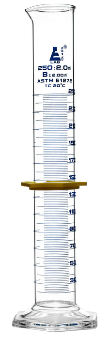 250ml capacity measuring cylinder made of high quality, heavy duty Borosilicate 3.3 glass. Hexagonal base for extra stability. Class B tolerance, ±2.00ml as per ISO/ASTM. Fitted with a plastic, hexagonal protective collar.Cylinder stands 12" tall, with a base measuring 3.6" wide. Inner diameter of cylinder body measures 1.5", and outer diameter measures 1.7".Autoclavable, with superior chemical durability. Low temperature gradient- can withstand high temperatures & thermal shocks. Eisco Labs Borosilicate glass has the following heat tolerances: Strain Point -515°C | Annealing Point 565°C | Softening Point 820°C.