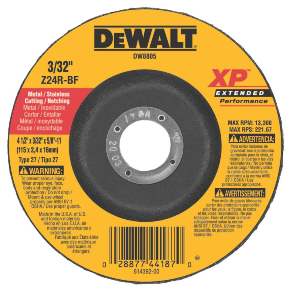 Dewalt* Depressed Center Wheel 1/8 In^ Dewalt* Depressed Center Wheel, Extended Performance Type 27, Abrasive Material: Silicon Carbide, Applications: Cutting/Notching Of Ferrous Metal And Ss, Grit: Z24R, Arbor Thread - Tpi/Pitch: 5/8 In-11 In, Speed: 13300 Rpm, Thickness: 1/8 In, Diameter: 4-1/2 I