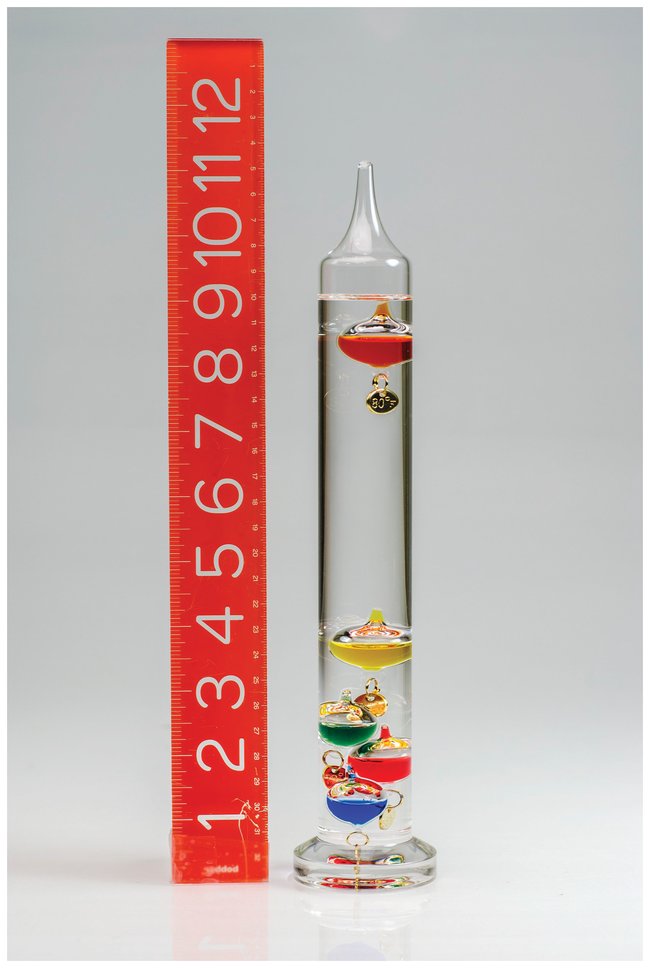 Galileo Galilei discovered when a liquid's temperature increases, it's density decreases. His findings inspired these unusual and interesting thermometers.Decorative functional thermometer is a great conversation piece perfect for the home or officeSealed glass cylinder contains a clear liquid and several glass spheres of varying densities that individually rise or fall to indicate temperatureTag on the lowest sphere in the top group indicates the current temperatureCurrent temperature is indicated by lowest sphere in the top groupIndividually calibratedAccuracy: ±2°C or ±4°FMade up of glassIndividually packaged