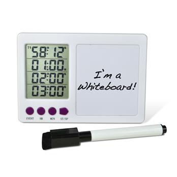 This four channel timer has a built in white board that helps keep track of time and other critical information.Audible alarm for each channelBuilt in white board and dry erase marker with eraser tip (included) helps keep track of crucial informationPrograms: hours/minutes; Displays: hours/minutes/secondsSwitchable timing capacity: 23 hours: 59 minutes / 59 minutesCount direction: up/down; displays elapsed time after countdownLast time set memoryKey press confirmation feature gives an audible indication of data entryLay flat on a bench, use the flip-open stand for a vertical view, or use the magnetic back for metal surface attachmentRequires two AAA batteries (included)Includes Statement of Traceability indicating accuracy traceable to the National Institute of Standards and Technology (NIST) and recognized by the signatories to the International Laboratory Accreditation Cooperation (ILAC)/Mutual Recognition Arrangement (MRA)Individually tested and inspected using NIST methods, in H-B’s exclusive A2LA accredited/ISO9001/ISO14001 registered laboratory, assuring conformance to the measuring instrument requirements of ISO 17025:2005 and ANSI/NCSL Z540-1Includes multi-language instructions (English, French, German, Italian, Portuguese and Spanish)CE approved; RoHS compliantCertificate of CalibrationTimer Accuracy: ± 5 seconds/dayDisplay Size (W x H): 43.2 x 53.3mm (1.7 x 2.1”)Dimensions (W x H x D): 114.3 x 88.9 x 25.4mm (4.9 x 3.5 x 1”)Please note: The aforementioned A2LA accreditation belongs to the manufacturer, not Thomas Scientific.