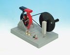 A hand-driven pulley is coupled to the smaller dynamo pulley by a rubber belt to give a step-up ratio.Turning the pulley generates AC and DC currents via two commutator circuits graphically printed on the base of the dynamoThe outputs are via 4mm socketsCurrent generation is demonstrated by compatible bulb sockets supplied with the unitStudents can also use generator to quantify by plugging an ammeter to the socket